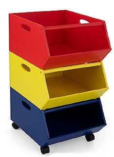 Includes four wheeled rolling toy chest with three plastic storage bins in primary colors. This item is great for storage shelf and for display of favorite toys. Assembly required.