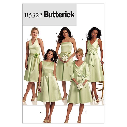 Butterick Patterns B5322, MISSES' DRESS AND SASH: Lined dresses A, B, C, D, E, below mid-knee, have fitted bodice with neckline variations, flared skirt and back zipper closure. A, B, C: princess seams. D, E: mock wrapped bodice. E: collar and elbow length sleeve. C, D, E: self-fabric sash. A, B: ribbon. B: purchased flower. NOTIONS: Dress A, B: 16" Zipper. Also for A: 13/4 yds. of 1/4" Covered Boning, 21/2 yds. of 3/4" Ribbon. B: 1 yd. of 1/4" Covered Boning, 21/2 yds. of 2" Ribbon and One Approximately 4" Flower. C, D, E: 24" Zipper. A, B, C, D, E: Hooks and Eyes. FABRICS: Bridal Satin, Peau de soie, Crepe, Matte Satin, Lightweight Broadcloth, Cotton Damask, Taffeta and Shantung. Unsuitable for obvious diagonals. Allow extra fabric to match plaids or stripes. Use nap yardages/layouts for pile, shaded or one-way design fabrics. *with nap. **without nap. Widths/Lengths on Instruction Sheet. Combinations: BB(8-10-12-14), F5(16-18-20-22-24) MULTI-SIZED FOR CUSTOM FIT