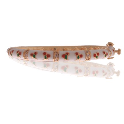 Kaylah Designs K22, Are you looking for the perfect baby gift? This adorable bangle has a double lock safety clasp, so it is hard for a child to take it off. There is a red cherry design on the white enamel brass bangle. This bangle fits approximately a 5" wrist.